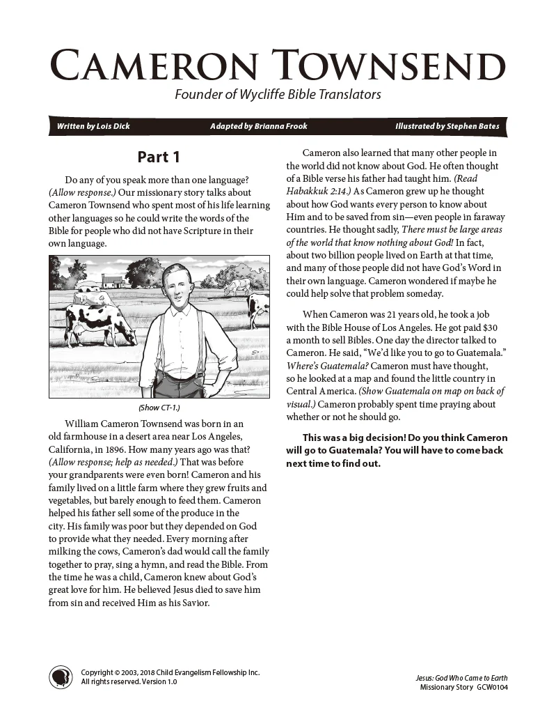 Cameron Townsend, founder of Wycliffe Bible Translators, had a passion for people who did not have the Word of God in their own language. God used him to minister to many different people groups. Children will be challenged to share God's Word with those who have not heard about Him.